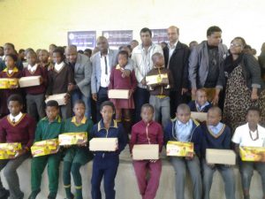 Mr Phili went on to tell us that in his upbringing he only started wearing school shoes in Grade 6. Even those shoes were second hand. He remembers walking long distances (barefooted) on rainy days to Bhekokuhle Primary School on an empty stomach. That experience taught him about the values of giving as he was also once in that unfortunate position.